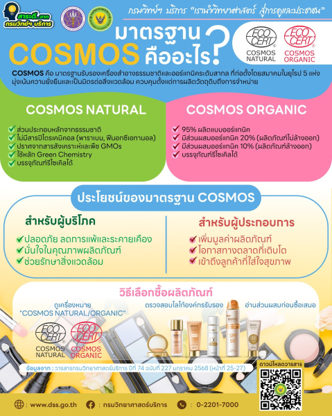 COSMOS คือมาตรฐานรับรองเครื่องสำอางธรรมชาติและออร์แกนิกส์ระดับสากล ที่ใส่ใจตั้งแต่แหล่งวัตถุดิบจนถึงมือผู้บริโภค ไม่ว่าจะเป็น COSMOS NATURAL ที่เน้นส่วนประกอบจากธรรมชาติ ปราศจากสารเคมี หรือ COSMOS ORGANIC ที่ต้องมีส่วนผสมออร์แกนิกถึง 95% ทั้งสองมาตรฐานนี้ช่วยให้มั่นใจได้ว่าผลิตภัณฑ์ที่คุณใช้ปลอดภัย เป็นมิตรต่อสิ่งแวดล้อม และดีต่อสุขภาพของคุณ!