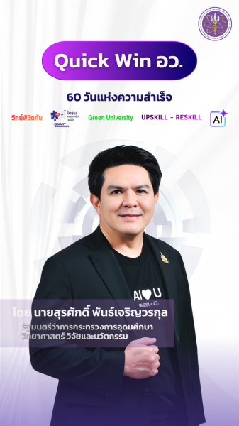 เมื่อวันที่ 8 ธันวาคม 2568 นายสุรศักดิ์ พันธ์เจริญวรกุล รัฐมนตรีว่าการกระทรวงการอุดมศึกษา วิทยาศาสตร์ วิจัยและนวัตกรรม (อว.) แถลงผลการดำเนินงานตามนโยบาย “Quick Win อว. : 60 วันแห่งความสำเร็จ” มุ่งเน้นผลลัพธ์ที่เป็นรูปธรรม เพื่อประโยชน์สูงสุดของพี่น้องประชาชน