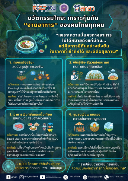 นวัตกรรมไทย: เกราะคุ้มกัน "จานอาหาร" ของคนไทยทุกคน กองทุนส่งเสริมวิทยาศาสตร์ วิจัยและนวัตกรรม (ววน.) โดยสำนักงานคณะกรรมการส่งเสริมวิทยาศาสตร์ วิจัยและนวัตกรรม (สกสว.) มุ่งมั่นขับเคลื่อนงานวิจัยและนวัตกรรมด้านความมั่นคงทางอาหาร ผ่านการสนับสนุนมากกว่า 8,000 โครงการวิจัยด้านอาหาร เพื่อสร้างหลักประกันว่าคนไทยทุกคนจะมีอาหารที่เพียงพอ ปลอดภัย และเข้าถึงได้