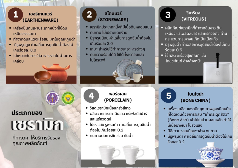 เซรามิกที่ใช้กับอาหารซึ่ง กรมวิทยาศาสตร์บริการให้การรับรอง สามารถแบ่งออกเป็นหลายประเภทตามลักษณะการใช้งานและคุณสมบัติของวัสดุ โดยแต่ละประเภทผ่านการทดสอบด้านความปลอดภัย การละลายของสารโลหะหนัก และความเหมาะสมต่อการสัมผัสอาหาร เพื่อสร้างความมั่นใจให้ผู้บริโภคและผู้ประกอบการ ดังนี้