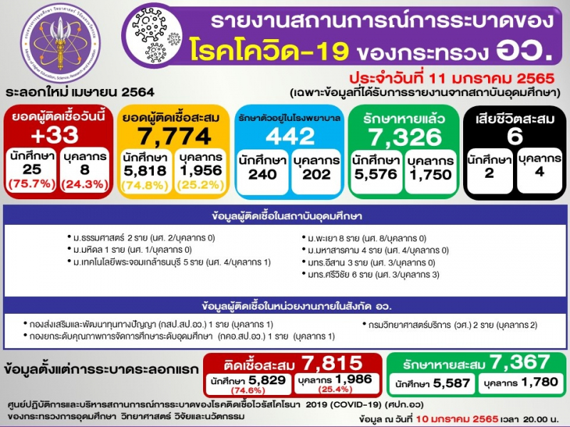ข้อมูล : ศูนย์ปฏิบัติการและบริหารสถานการณ์การระบาดของโรคติดเชื้อไวรัสโคโรนา 2019 (COVID-19) (ศปก.อว.)
