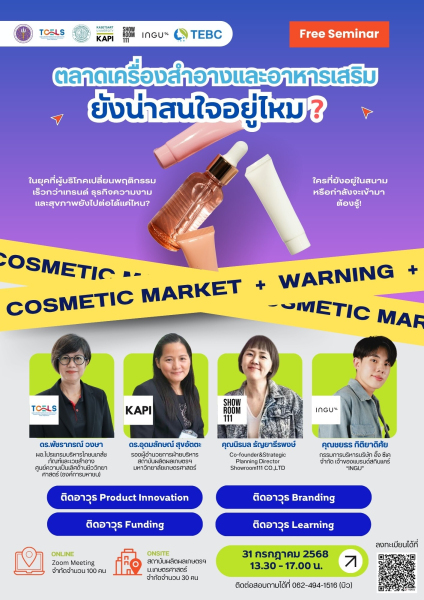 บริษัท เค-เอพีไอ จำกัด (K-API) ร่วมกับ สถาบันผลิตผลทางการเกษตรและอุตสาหกรรมเกษตร มหาวิทยาลัยเกษตรศาสตร์ จัดงานสัมมนา “ตลาดเครื่องสำอางและอาหารเสริมยังน่าสนใจอยู่ไหม?” ในวันพฤหัสบดีที่ 31 ก.ค. 2568 เวลา 13.30 – 17.00 น. ขอเชิญชวนผู้ประกอบการ SME, ผู้ประกอบการเครื่องสำอางและอาหารเสริม, เจ้าของแบรนด์เครื่องสำอางและอาหารเสริม, นักการตลาดเครื่องสำอางและอาหารเสริม หรือ ผู้ที่สนใจธุรกิจความงามและสุขภาพ ลงทะเบียนเข้าร่วมฟังงานสัมมนาได้ฟรี (ไม่มีค่าใช้จ่าย) ณ สถาบันผลิตผลทางการเกษตรและอุตสาหกรรมเกษตร มหาวิทยาลัยเกษตรศาสตร์ บางเขน เปิดรับจำนวน 30 ท่าน และเข้าร่วมรับฟังสัมมนาทางออนไลน์ได้ที่ Zoom Meeting เปิดรับจำนวน 100 คน