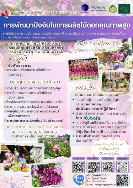 กระทรวงการอุดมศึกษา วิทยาศาสตร์ วิจัยและนวัตกรรม (อว.) โดย ศูนย์เชี่ยวชาญนวัตกรรมเกษตรสร้างสรรค์ และสถานีวิจัยลำตะคอง สถาบันวิจัยวิทยาศาสตร์และเทคโนโลยีแห่งประเทศไทย (วว.) ร่วมกับเครือข่ายพันธมิตรเอกชน ได้แก่ บริษัทโฮมซีดเมล็ดพันธุ์ตราบ้าน และบริษัทสยามคูโบต้า จัดอบรม ฟรี!! หลักสูตร “การพัฒนาปัจจัยในการผลิตไม้ดอกคุณภาพสูง” ในวันที่ 1 และ 5-6 มีนาคม 2569 ณ สถานีวิจัยลำตะคอง จ.นครราชสีมา ภายใต้การดำเนิน โครงการนวัตกรรมเกษตรสร้างสรรค์เพื่อการผลิตไม้ดอกอุตสาหกรรมและการท่องเที่ยว โดยผู้สนใจสามารถลงทะเบียนเข้าร่วมอบรมเชิงปฏิบัติการจำนวน 3 รอบ ตามกลุ่มพืชที่สนใจได้ตั้งแต่บัดนี้ถึงวันที่ 28 กุมภาพันธ์ 2569