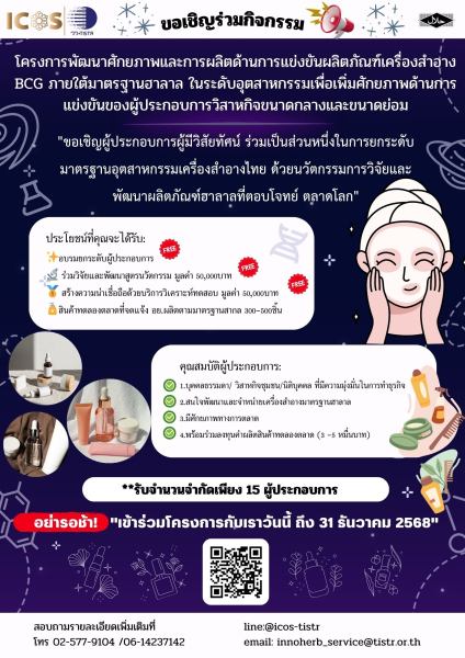 กระทรวงการอุดมศึกษา วิทยาศาสตร์ วิจัยและนวัตกรรม (อว.) โดย ศูนย์บริการนวัตกรรมเวชสำอางแบบครบวงจร (ICOS) ในสังกัด ศูนย์เชี่ยวชาญนวัตกรรมผลิตภัณฑ์สมุนไพร สถาบันวิจัยวิทยาศาสตร์และเทคโนโลยีแห่งประเทศไทย (วว.) เชิญชวนผู้ประกอบการเข้าร่วมโครงการพัฒนาศักยภาพและการผลิตด้านการแข่งขันผลิตภัณฑ์เครื่องสำอาง BCG ภายใต้มาตรฐานฮาลาลในระดับอุตสาหกรรม เพื่อเพิ่มศักยภาพด้านการแข่งขันของผู้ประกอบการวิสาหกิจขนาดกลางและขนาดย่อม เปิดรับสมัครตั้งแต่บัดนี้ถึงวันที่ 31 ธันวาคม 2568 **รับจำนวนจำกัดเพียง 15 ผู้ประกอบการ** เท่านั้น !!