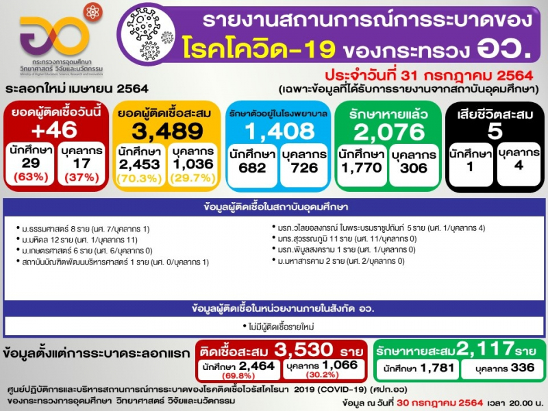 ข้อมูล : ศูนย์ปฏิบัติการและบริหารสถานการณ์การระบาดของโรคติดเชื้อไวรัสโคโรนา 2019 (COVID-19) (ศปก.อว.)