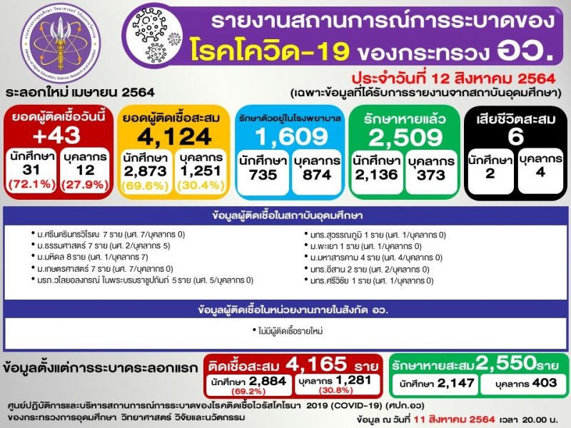 ข้อมูล : ศูนย์ปฏิบัติการและบริหารสถานการณ์การระบาดของโรคติดเชื้อไวรัสโคโรนา 2019 (COVID-19) (ศปก.อว.)