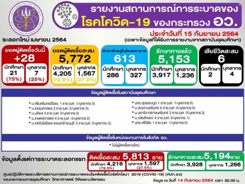 ข้อมูล : ศูนย์ปฏิบัติการและบริหารสถานการณ์การระบาดของโรคติดเชื้อไวรัสโคโรนา 2019 (COVID-19) (ศปก.อว.)