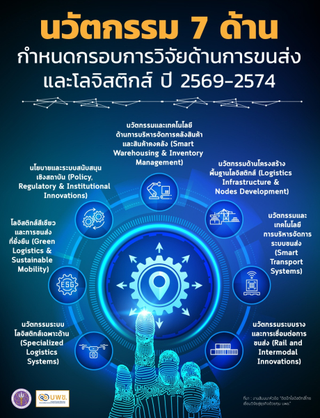 กรอบการวิจัยด้านการขนส่งและโลจิสติกส์ ช่วงปี 2569-2574 ของ บพข. มีเป้าหมายหลักเพื่อยกระดับขีดความสามารถด้านขนส่งและโลจิสติกส์ของประเทศให้สามารถแข่งขันได้ในระดับภูมิภาคและโลก ผ่านการพัฒนาเทคโนโลยี นวัตกรรม และโครงสร้างพื้นฐานที่ยั่งยืน เชื่อมโยงทุกมิติของเศรษฐกิจ สังคม และสิ่งแวดล้อม ซึ่งประกอบด้วย นวัตกรรม 7 ด้าน ได้แก่”