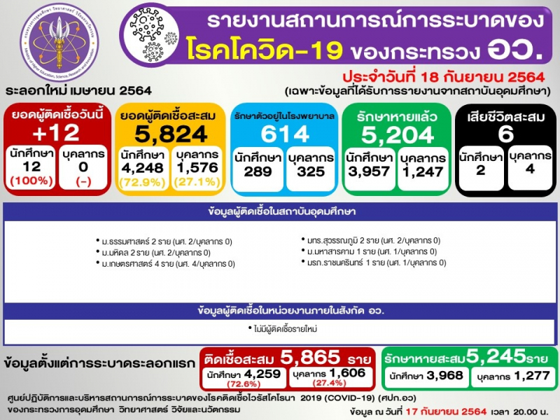 ข้อมูล : ศูนย์ปฏิบัติการและบริหารสถานการณ์การระบาดของโรคติดเชื้อไวรัสโคโรนา 2019 (COVID-19) (ศปก.อว.)