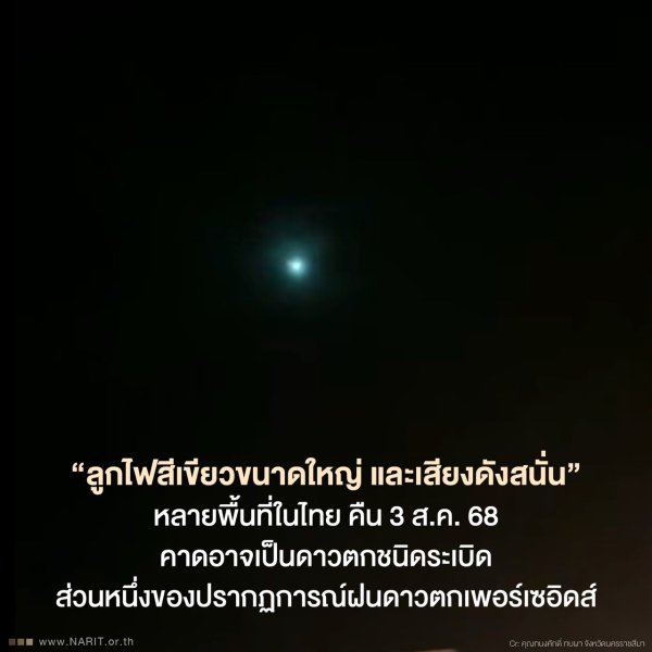 ดร. วิภู รุโจปการ ผู้อำนวยการสถาบันวิจัยดาราศาสตร์ กล่าวว่า จากข้อมูลที่มีการเผยแพร่ คลิปวิดีโอและภาพถ่ายในโซเชียลมีเดีย ช่วงคืนวันที่ 3 สิงหาคม 2568 เวลาประมาณ 23:52 - 23:55 น. หลายพื้นที่ในเขตภาคกลาง ภาคตะวันออก และภาคตะวันออกเฉียงเหนือ อาทิ กรุงเทพมหานคร พระนครศรีอยุธยา นครปฐม สมุทรปราการ สมุทรสาคร อ่างทอง นครนายก นนทบุรี สระแก้ว ฉะเชิงเทรา ชลบุรี ขอนแก่น อุดรธานี นครราชสีมา ศรีสะเกษ บุรีรัมย์ กาฬสินธุ์ สุรินทร์ มีข้อมูลรายงานพบเห็นลูกไฟสีเขียวขนาดใหญ่วิ่งพาดผ่านท้องฟ้าเป็นแนวยาวประมาณ 10 วินาที พุ่งจากทางทิศตะวันออก พร้อมได้ยินเสียงดังสนั่นคล้ายเสียงระเบิดตามมา
