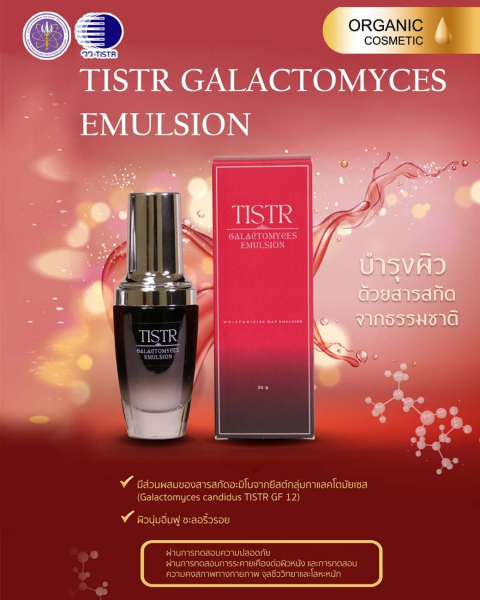 ด้วยประสิทธิภาพของสารสกัดที่มีฤทธิ์ชะลอริ้วรอย จึงนำมาสู่การพัฒนา ผลิตภัณฑ์เครื่องสำอางต้นแบบอิมัลชันที่มีส่วนผสมจากสารออกฤทธิ์เชิงหน้าที่ประเภทกรดอะมิโนจากยีสต์สกุลกาแลคโตมัยเซส (TISTR GALACTOMYCES EMULSION) ใช้สำหรับผิวหน้า ทำให้ผิวนุ่มชุ่มชื่น เรียบเนียน เพื่อสุขภาพที่ดีของผิว โดยผลิตภัณฑ์ได้ผ่านการควบคุมคุณภาพของผลิตภัณฑ์ ได้แก่ ทางกายภาพ จุลชีววิทยา โลหะหนัก รวมไปถึงผ่านการทดสอบความปลอดภัย เพื่อให้ได้ผลิตภัณฑ์ที่มีคุณภาพเป็นที่ยอมรับ ส่งผลให้เพิ่มมูลค่าของผลิตภัณฑ์ เกิดการต่อยอดเป็นผลิตภัณฑ์เครื่องสำอางที่ให้เกิดประโยชน์สูงสุด