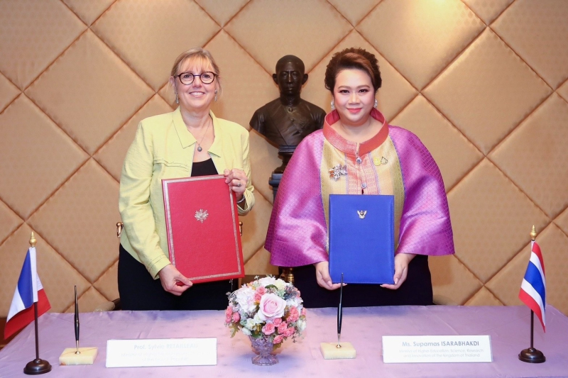 เมื่อวันที่ 20 ต.ค. นางสาวศุภมาส อิศรภักดี รมว.การอุดมศึกษา วิทยาศาสตร์ วิจัยและนวัตกรรม (อว.) ให้การต้อนรับ ศ.ซีลวี เรอตาโย รมว.การอุดมศึกษาและการวิจัยแห่งสาธารณรัฐฝรั่งเศส พร้อมหารือความร่วมมือทวิภาคีด้านการอุดมศึกษา การวิจัยและนวัตกรรม และร่วมลงนาม “แถลงการณ์แสดงเจตจำนงระหว่างกระทรวงการอุดมศึกษา วิทยาศาสตร์ วิจัยและนวัตกรรมแห่งราชอาณาจักรไทย กับกระทรวงการอุดมศึกษาและการวิจัยแห่งสาธารณรัฐฝรั่งเศส ว่าด้วยความร่วมมือด้านการอุดมศึกษา วิทยาศาสตร์ วิจัยและนวัตกรรม” ซึ่งเป็นกรอบการดำเนินความร่วมมือระหว่างสถาบันอุดมศึกษาและหน่วยงานวิจัยของทั้งสองประเทศ บนพื้นฐานของความเสมอภาคและผลประโยชน์ร่วมกัน