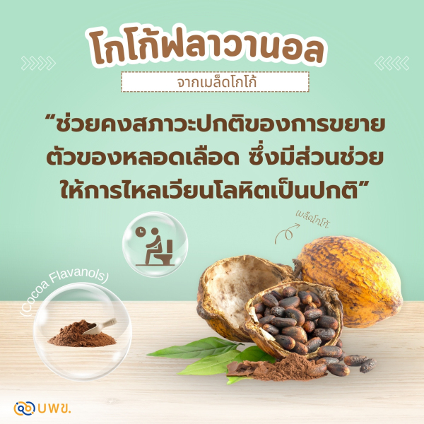 สำหรับสรรพคุณของ “โกโก้ฟลาวานอล” (Cocoa flavanols) จากเมล็ดโกโก้ ที่ได้รับอนุญาตให้อ้างบนฉลากได้ คือ ช่วยคงสภาวะปกติของการขยายตัวของหลอดเลือด ซึ่งมีส่วนช่วยให้การไหลเวียนโลหิตเป็นปกติ