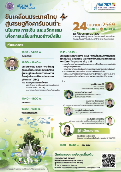 กระทรวงการอุดมศึกษา วิทยาศาสตร์ วิจัยและนวัตกรรม (อว.) โดย สำนักงานพัฒนาวิทยาศาสตร์และเทคโนโลยีแห่งชาติ (สวทช.) ชวนผู้สนใจ มาร่วมเปลี่ยนวิกฤตกติกาโลกให้เป็นโอกาสของธุรกิจในสัมมนา NAC2026 ! "ขับเคลื่อนประเทศไทยสู่เศรษฐกิจคาร์บอนต่ำ: นโยบายการเงินและนวัตกรรมเพื่อการเปลี่ยนผ่านอย่างยั่งยืน" ภายในงานสัมมนานี้ สวทช. ชวนหน่วยงานระดับประเทศ อาทิ กรมการเปลี่ยนแปลงสภาพภูมิอากาศฯ, ธนาคารแห่งประเทศไทย, ก.ล.ต., สภาอุตสาหกรรมฯ ร่วมเจาะลึกนโยบายรัฐที่ภาคธุรกิจต้องรู้เพื่อปรับตัวสู่ Net-Zero พร้อมรับมือวิกฤตโลก พบกันวันที่ 24 เม.ย. 2569 เวลา13.30-16.30 น. ณ อุทยานวิทยาศาสตร์ประเทศไทย จ.ปทุมธานี สำรองที่นั่งล่วงหน้า ลงทะเบียนร่วมงานฟรี ได้ที่ https://www.nstda.or.th/nac/2026/seminar/nac-01/