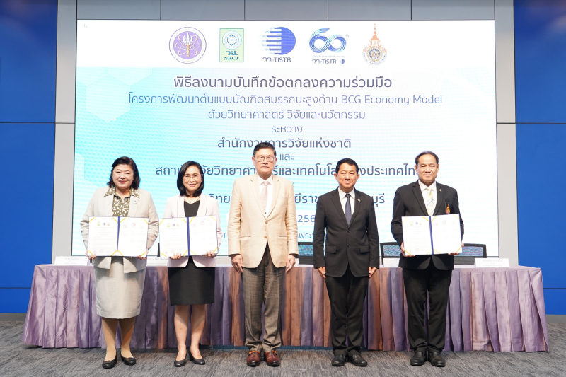 เมื่อวันที่ 12 เม.ย. ศ.(พิเศษ) ดร.เอนก เหล่าธรรมทัศน์ รัฐมนตรีว่าการกระทรวงการอุดมศึกษา วิทยาศาสตร์ วิจัยและนวัตกรรม (อว.) เป็นประธานในพิธีลงนามบันทึกข้อตกลงความร่วมมือ (MOU) โครงการพัฒนาต้นแบบบัณฑิตสมรรถนะสูงด้าน BCG Economy Model ด้วยวิทยาศาสตร์ วิจัยและนวัตกรรม ระหว่าง ดร.ชุติมา เอี่ยมโชติชวลิต ผู้ว่าการสถาบันวิจัยวิทยาศาสตร์และเทคโนโลยีแห่งประเทศไทย (วว.) ดร.วิภารัตน์ ดีอ่อง ผู้อำนวยการสำนักงานการวิจัยแห่งชาติ (วช.) และ รศ.ดร.สมหมาย ผิวสอาด อธิการบดีมหาวิทยาลัยเทคโนโลยีราชมงคลธัญบุรี (มทร.ธัญบุรี) โดยมี ศ.ดร.นพ.สิริฤกษ์ ทรงศิวิไล ปลัดกระทรวง อว. ร่วมเป็นเกียรติและแสดงความยินดี พร้อมด้วยนายสัมพันธ์ เย็นสำราญ ที่ปรึกษารัฐมนตรีว่าการกระทรวง อว. ผู้บริหาร บุคลากรทั้งสามหน่วยงานเข้าร่วม ณ ห้องแถลงข่าว ชั้น 1 สำนักงานปลัดกระทรวง อว. (โยธี)